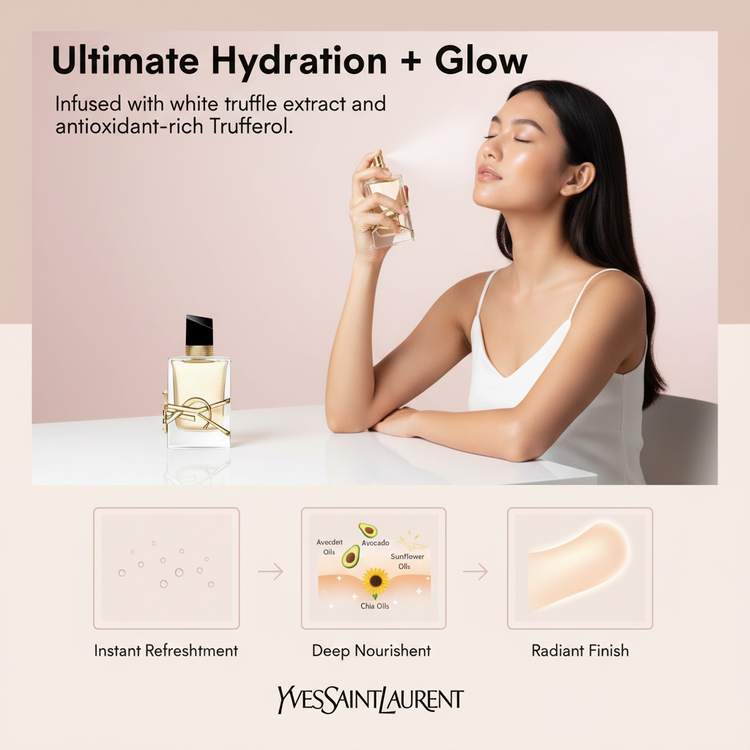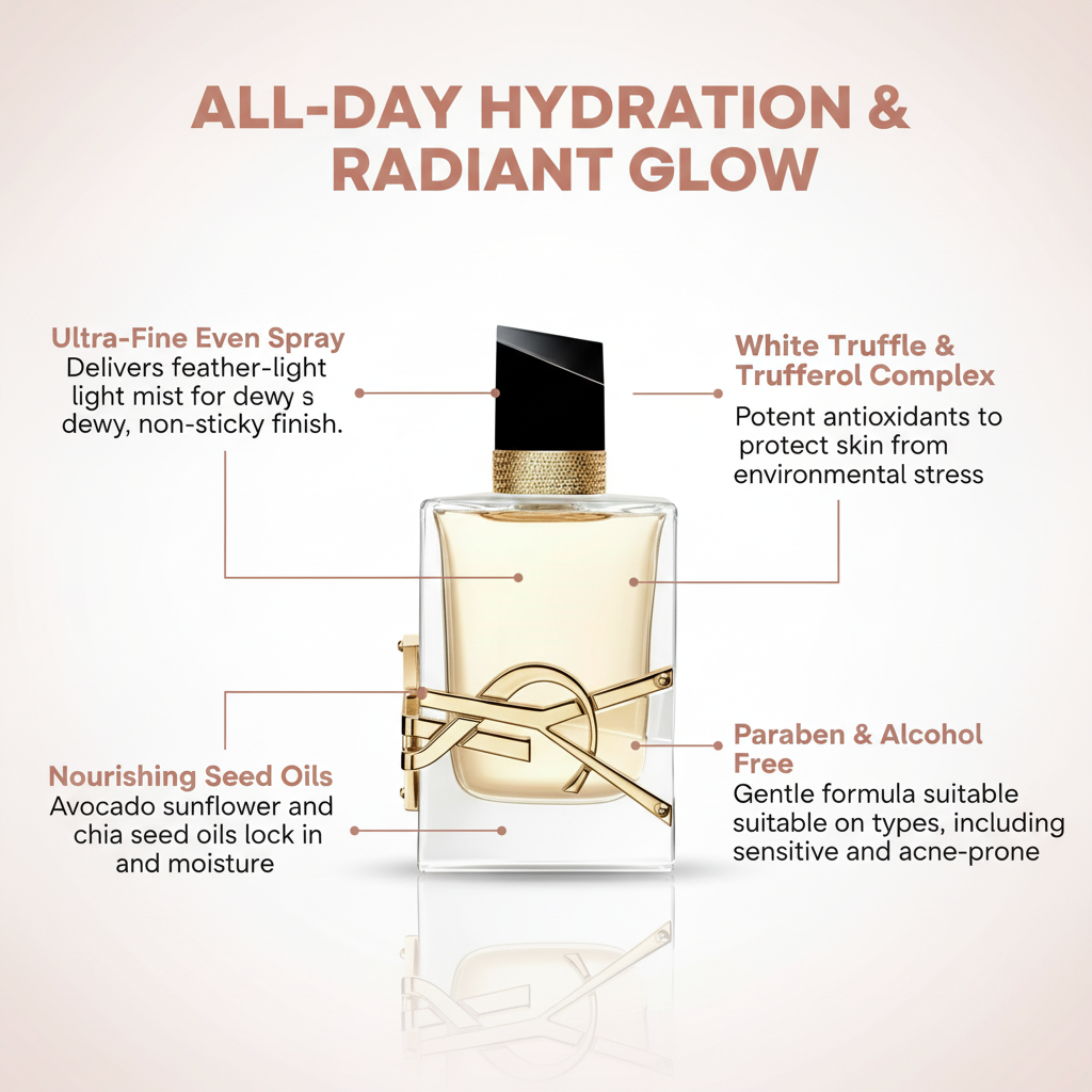 Our Libre EDP-S 30ml mist delivers lightweight hydration and a natural glow. Infused with white truffle extract and Trufferol antioxidants, it locks in moisture with avocado, sunflower, and chia oils without any paraben, alcohol, silicone, or surfactant. Vegan and cruelty-free—perfect for daily use and makeup set-up.